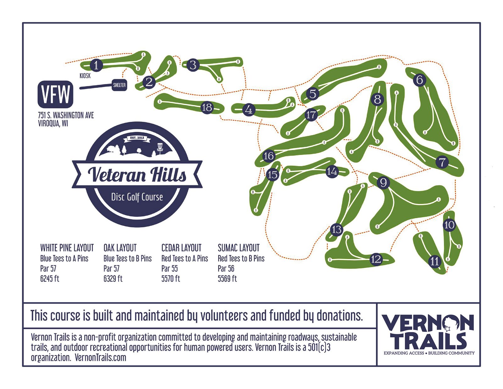 Veteran Hills Disc Golf Course exists because of a powerful partnership between Vernon Trails and the Viroqua VFW. Since 2013, we’ve transformed 40+ acres of their land into a championship-level disc golf course with 18 holes, multiple alternate layouts, and ongoing upgrades.